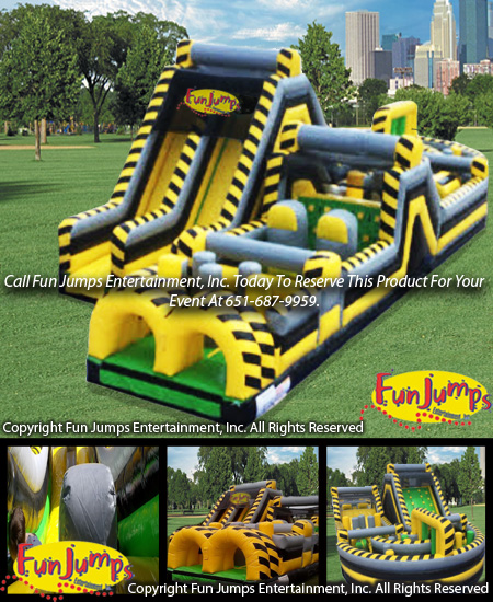 Two opponents race through each of the running lanes: up & over, log crawls, pop ups, squeeze walls, climb slide, tunnel crawls, u-turn pop ups, rock climb, and then the huge slide to the finish. This design allows the crowd to view the competitors at the start and finish. The Mega Meltdown offers an intense challenge for any competition or team building event.