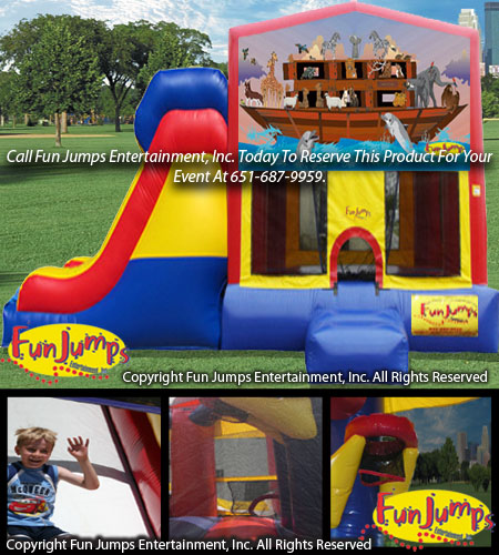 The Noahs Ark On The Sea XL Slide Combo contains a large jumping area, basketball hoop, a ramp to climb up and a large slide to go down. It will definitely be a hit at your next FUN event!