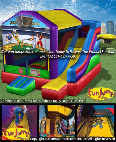 The All Sports Slide Combo has a jumping area, crawl-through, climbing obstacle, slide, twister and basketball hoops. Both young and old will enjoy the fun!