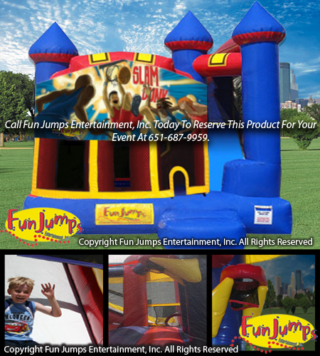 Be like Kevin Love and Kevin Garnett with this awesome basketball themed 4 in 1 combo! This inflatable contains a large jumping area, basketball hoop, a ramp to climb up and a slide to go down!