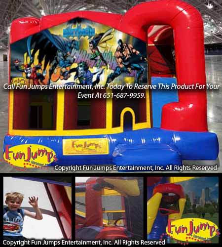 Party guests are sure to feel like Batman in this 4 in 1 Combo unit. Filled with plenty of fun, it has a jumping area, a climbing ramp, a slide and a basketball hoop. This unit will keep kids busy for hours!