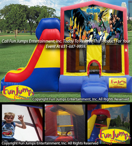 The Batman XL Slide Combo contains a large jumping area, basketball hoop, a ramp to climb up and a large slide to go down. It will definitely be a hit at your next FUN event!