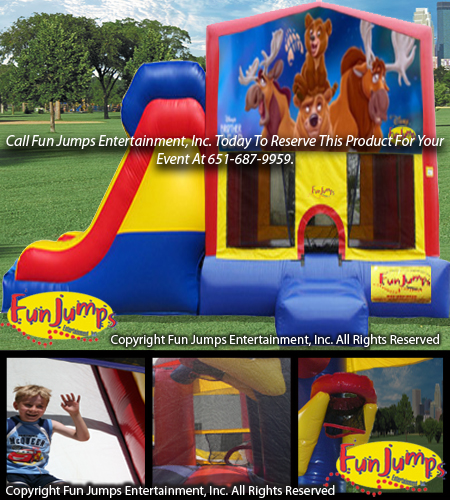 The Brother Bear XL Slide Combo contains a large jumping area, basketball hoop, a ramp to climb up and a large slide to go down. It will definitely be a hit at your next FUN event!