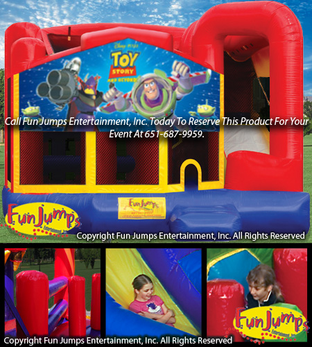 This 6 in 1 Buzz Lightyear themed combo is a super exciting party rental that would make any event a huge success! Inside there is a jumping area, a basketball hoop, a tunnel, pop up obstacles, a climbing ramp and a slide.