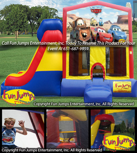 The Cars XL Slide Combo contains a large jumping area, basketball hoop, a ramp to climb up and a large slide to go down. It will definitely be a hit at your next FUN event!