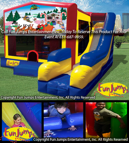 Come jump with Christmas characters this exciting 7 in 1 combo. Party goers will be entertained for hours by jumping, crawling, climbing, sliding and playing basketball.