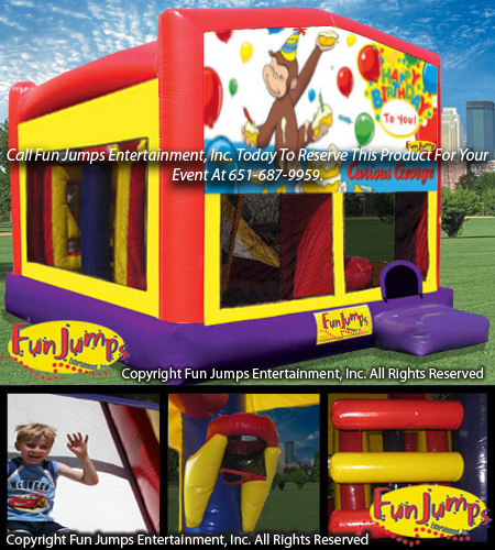 This All in 1 Curious George themed combo is a super exciting party rental that would make any event a huge success! Inside there is a jumping area, a basketball hoop, a tunnel, pop up obstacles, a climbing ramp and a slide.