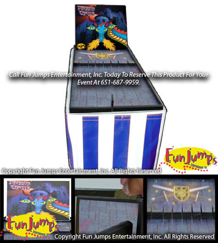 Enter If You Dare!!! This castle is guarded by a fierce fire breathing dragon. Players drop the coins in the coin slot an attempt to roll the coins between the walls of the castle and land the coins safely on the swords & shield to slay the dragon to win!