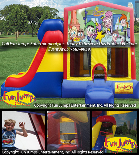 The Fairly Odd Parents XL Slide Combo contains a large jumping area, basketball hoop, a ramp to climb up and a large slide to go down. It will definitely be a hit at your next FUN event!