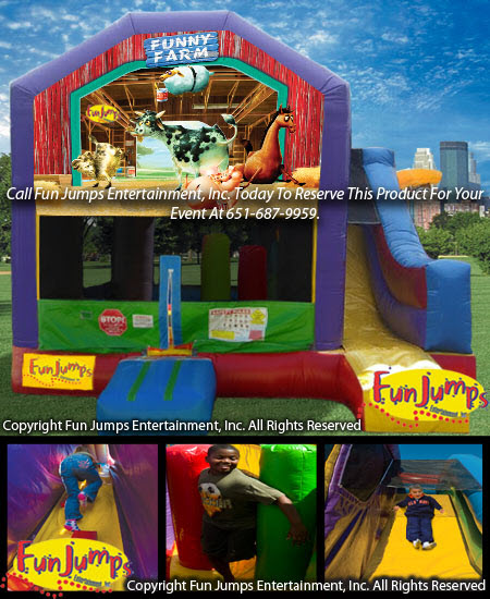 This funny farm moon bounce will have your kids giggling with these silly farm animals the entire day! This 7 in 1 inflatable contains a large jumping area, basketball hoops, obstacle pillars, a climbing ramp and a slide to go down!