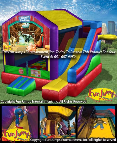 The Funny Farm Slide Combo has a jumping area, crawl-through, climbing obstacle, slide, twister and basketball hoops. Both young and old will enjoy the fun!