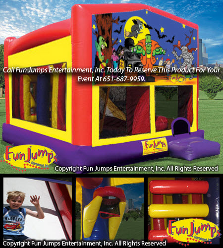 Get ready to scream and have the time of your life! Inside this excitingly scary inflatable, there is a jumping area, a basketball hoop, an exciting slide, a tunnel that has pop up obstacles and a ramp to climb the slide.