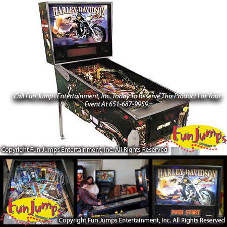 This Harley Davidson Pinball Machine will definitely challenge the young and old! Call Fun Jumps Entertainment or order online Today! Ages = Kids To Adults Power Requirement = (1)110 Circuit (20 amps) Size = 5' L x 3' W x 7' H Rental Rate = $375.00