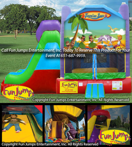 The Hawaiian Luau XL Slide Combo contains a large jumping area, basketball hoop, a ramp to climb up and a large slide to go down. It will definitely be a hit at your next FUN event!