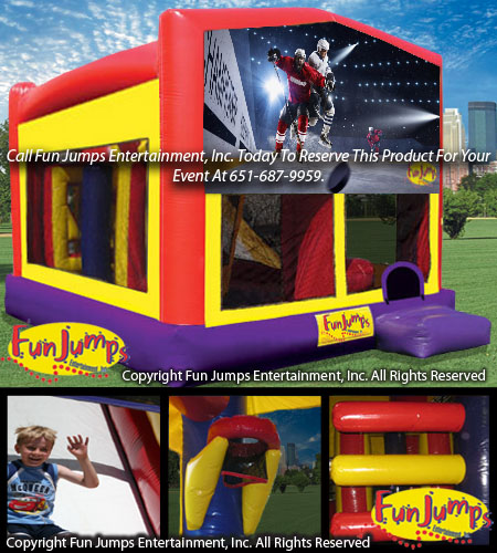 This All in 1 Hockey themed combo is a super exciting party rental that would make any event a huge success! Inside there is a jumping area, a basketball hoop, a tunnel, pop up obstacles, a climbing ramp and a slide.