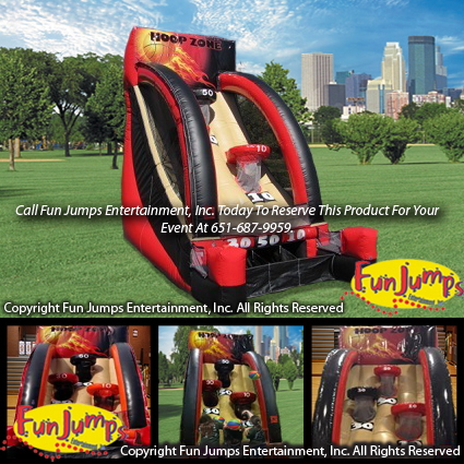 On this Hoop Zone Basketball Inflatable shooters try to shoot at 3 different hoops, each with a different point value. The harder the shot, the more points you can get if you make it. If you miss you get no points. The player with the most points after all the balls are shot is the winner. A great game for kids and adults! This basketball game is perfect for school carnivals, church festivals, corporate events, birthday parties, carnivals and any FUN event in the Twin Cities Area!