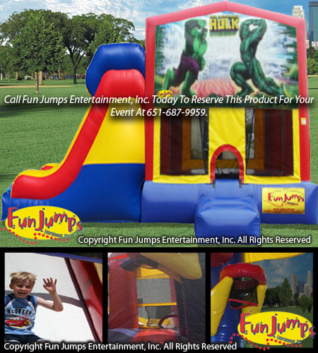 The Hulk XL Slide Combo contains a large jumping area, basketball hoop, a ramp to climb up and a large slide to go down. It will definitely be a hit at your next FUN event!