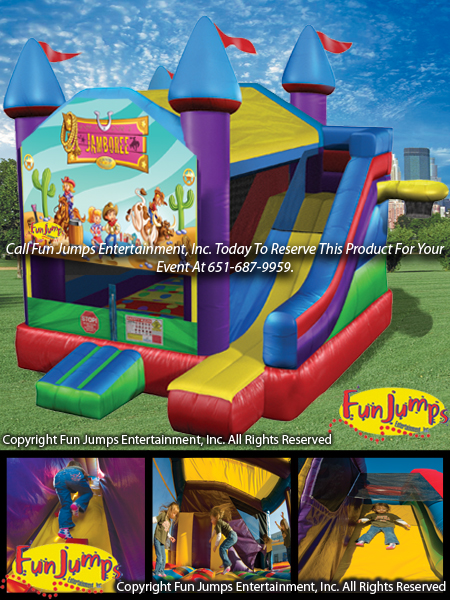 The Jamboree Castle Slide Combo has a jumping area, crawl-through, climbing obstacle, slide, twister and basketball hoops. Both young and old will enjoy the fun!