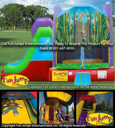The Jungle Island XL Slide Combo contains a large jumping area, basketball hoop, a ramp to climb up and a large slide to go down. It will definitely be a hit at your next FUN event!
