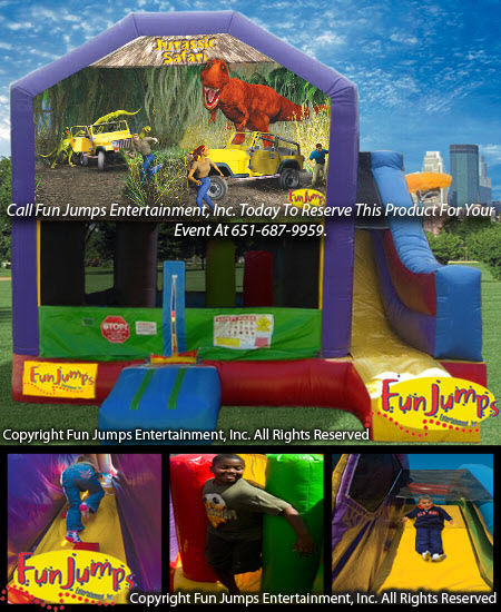ROOOAARRR! This combo will have your dinosaur lovers in a trance! This 7 in 1 inflatable contains a large jumping area, basketball hoops, obstacle pillars, a climbing ramp and a slide to go down!