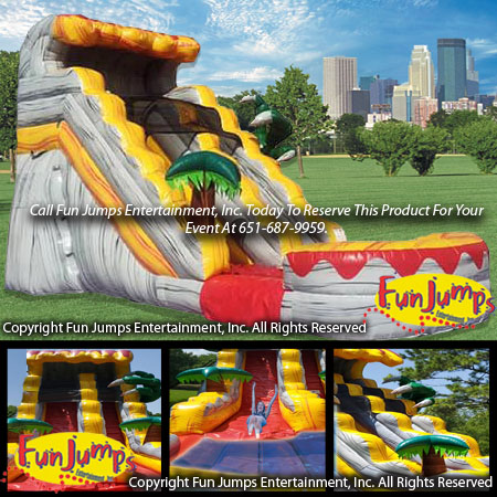 This single lane Inflatable Lava Falls Water Slide features a radical sliding angle that’s sure to get the adrenaline pumping as riders scream down this tropical themed slide, This Water Slide is great for Larger Summer Parties, Corporate Events, College Water Days, Summer Festivals, Church Festivals, Summer Camp Activities, Special Occasions in & around the Minneapolis - St Paul MN Area For Renting!