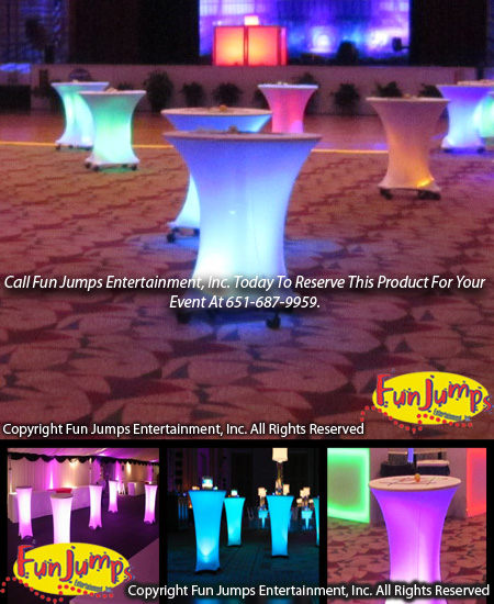 Our LED Glow High Top Tables are great for hosting cocktail parties, weddings or large events. Battery or plug in option available. Power Requirement = (1)110 Circuit (20 amps) Size = 30" L x 30" W x 42" H Rental Rate = $125.00