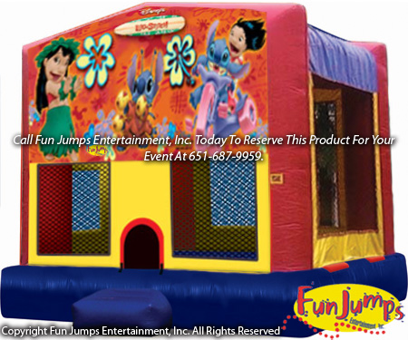 Come jump with Lilo & Stitch! This attractive and colorful unit provides jumpers with a place to jump and have fun. Ages = Kids To Adults Power Requirement = (1)110 Circuit (20 amps) Size = 15' L x 15' W x 14' H Rental Rate = $215.00