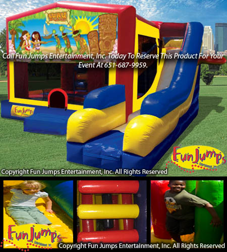 The Luau 7 in 1 Combo unit is a great addition at any event. Filled with excitement, this unit has a jumping area, crawl-through, climbing obstacle, slide and basketball hoop.