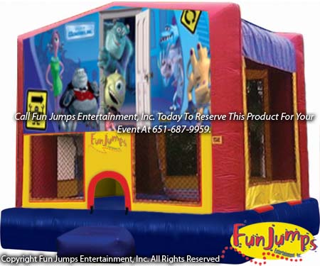 Once you open the door into the Monsters Inc Moonwalk the kids will scream with delight when they see Mike, Sulley & the Scare Gang. Ages = Kids To Adults Power Requirement = (1)110 Circuit (20 amps) Size = 15' L x 15' W x 14' H Rental Rate = $215.00