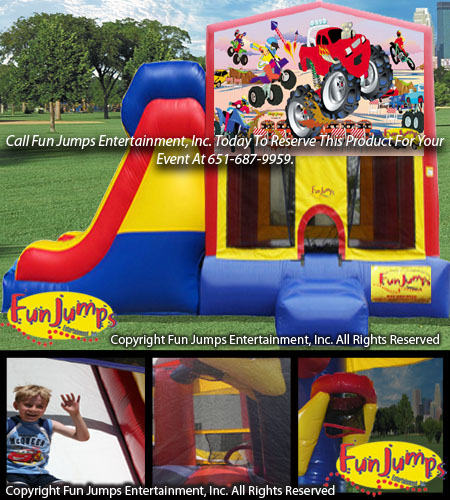 The Motorsports Rally XL Slide Combo contains a large jumping area, basketball hoop, a ramp to climb up and a large slide to go down. It will definitely be a hit at your next FUN event!