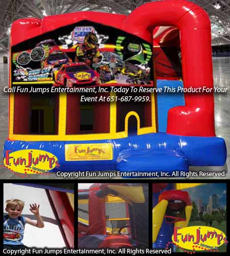 This Race Car 4 in 1 Combo unit is great for the NASCAR fan or race car driver! It will keep guests busy as they jump, crawl, climb, slide and play basketball.