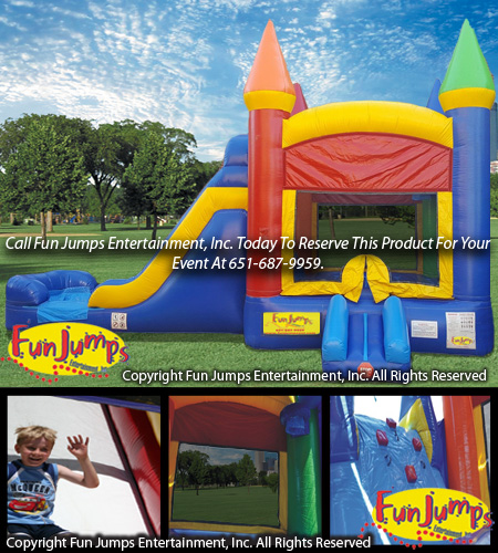 This Rainbow Castle XL Wet/Dry Water Slide Combo unit is perfect for any event. This Inflatable Features has a giant water slide, inflatable splash landing pad pool, a jumping area, crawl-through tunnel, climb, slide and basketball hoop all in one and is available in Minneapolis, St. Paul - Twin Cities, MN Metro Area!