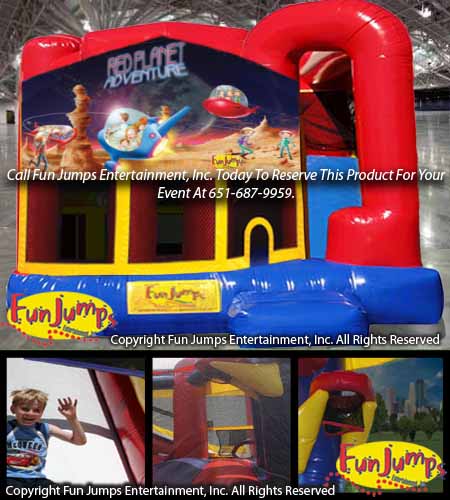 Get ready to have a party that is out of this world! This 4 in 1 Red Planet themed combo contains a large jumping area, basketball hoop, climbing ramp and a slide to go down!