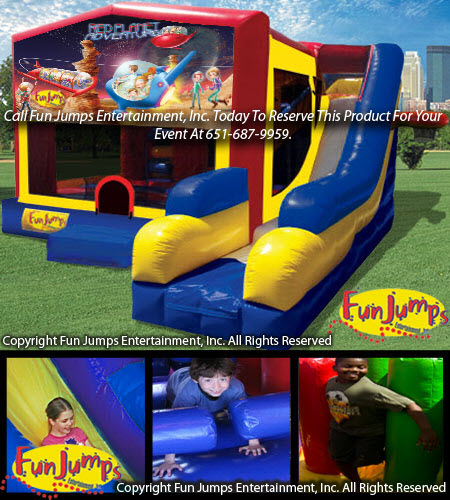 Get ready to have a party that is out of this world! This 7 in 1 Red Planet themed combo contains a large jumping area, basketball hoops, vertical and horizontal obstacle pillars, a ramp to climb up and a slide to go down!