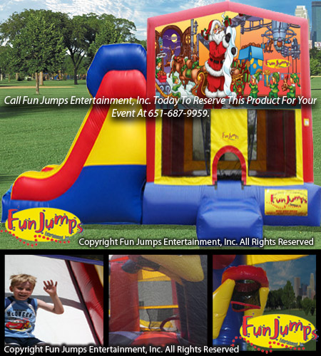 The Santa Claus XL Slide Combo contains a large jumping area, basketball hoop, a ramp to climb up and a large slide to go down. It will definitely be a hit at your next FUN event!