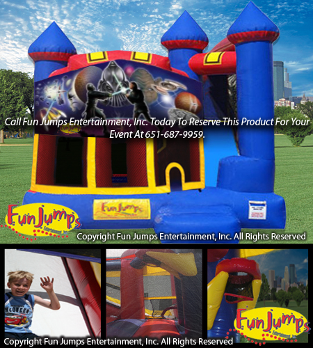 Be prepared for this galactic experience when you encounter large jumping area, basketball hoop, a ramp and slide This is a great inflatable rental for all types of parties and events!