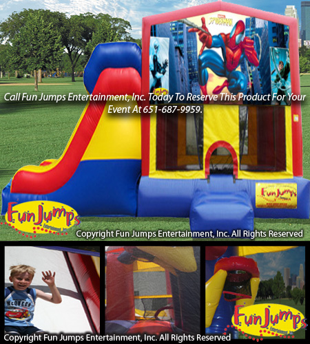 The Spider Man XL Slide Combo contains a large jumping area, basketball hoop, a ramp to climb up and a large slide to go down. It will definitely be a hit at your next FUN event!