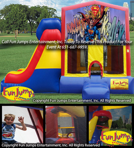 The Superman XL Slide Combo contains a large jumping area, basketball hoop, a ramp to climb up and a large slide to go down. It will definitely be a hit at your next FUN event!