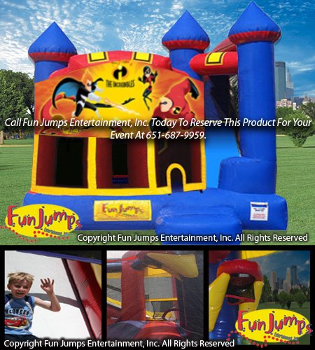 Come join Mr. Incredible, Elastigirl, Violet, Dash and Little Jack Jack save the world in this exciting 4 in 1 combo. Party goers will be entertained for hours by jumping, crawling, climbing, sliding and playing basketball.