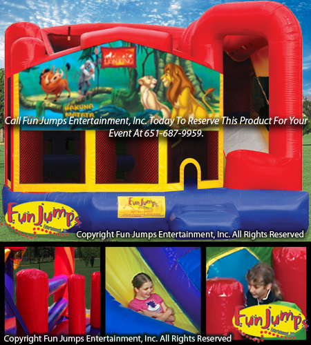 This 6 in 1 Lion King themed combo is a super exciting party rental that would make any event a huge success! Inside there is a jumping area, a basketball hoop, a tunnel, pop up obstacles, a climbing ramp and a slide.
