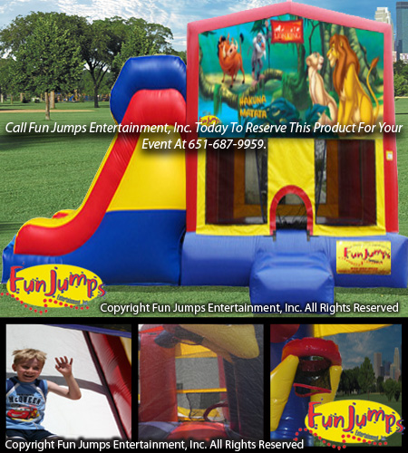 The Lion King XL Slide Combo contains a large jumping area, basketball hoop, a ramp to climb up and a large slide to go down. It will definitely be a hit at your next FUN event!