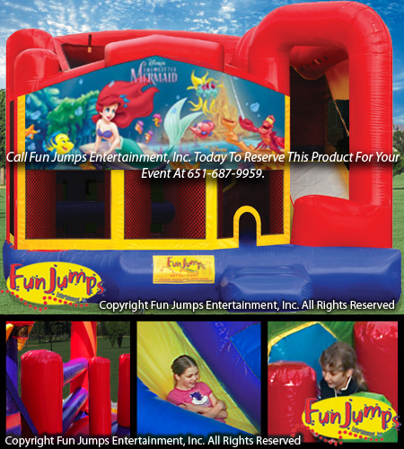 This 6 in 1 Little Mermaid themed combo is a super exciting party rental that would make any event a huge success! Inside there is a jumping area, a basketball hoop, a tunnel, pop up obstacles, a climbing ramp and a slide.