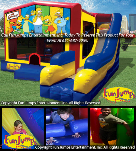 Come jump with the Simpsons in this exciting 7 in 1 combo. Party goers will be entertained for hours by jumping, crawling, climbing, sliding and playing basketball.