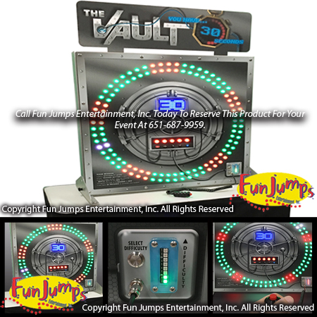 The Vault is the ultimate test of concentration and reaction tim. Players try to stop the moving light on the green dots, Each time the player is successful, the light moves faster, increasing the difficulty. Unlock all five tumblers in 30 seconds to win. This game is perfect for school carnivals, church festivals, corporate events, birthday parties, carnivals and any FUN event in the Twin Cities Area!
