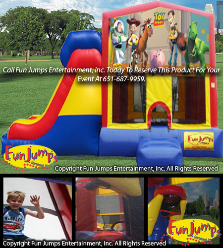 The Toy Story XL Slide Combo contains a large jumping area, basketball hoop, a ramp to climb up and a large slide to go down. It will definitely be a hit at your next FUN event!