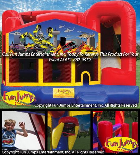 The Transformers 6 in 1 Combo unit provides hours of excitement. Participants can jump, crawl, climb, slide and play basketball. This inflatable will generate plenty of smiles.