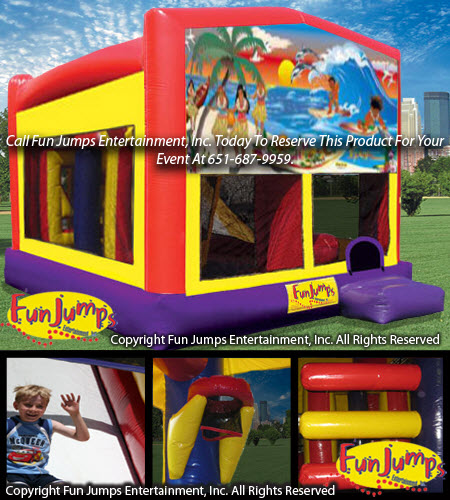 This all in 1 tropical paradise themed combo is a super exciting party rental that would make any tropical or Hawaiian themed party a huge success! Inside there is a jumping area, a basketball hoop, a tunnel, pop up obstacles, a climbing ramp and a slide.