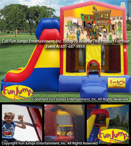The Western XL Slide Combo contains a large jumping area, basketball hoop, a ramp to climb up and a large slide to go down. It will definitely be a hit at your next FUN event!