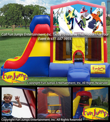 The Winter Fun XL Slide Combo contains a large jumping area, basketball hoop, a ramp to climb up and a large slide to go down. It will definitely be a hit at your next FUN event!