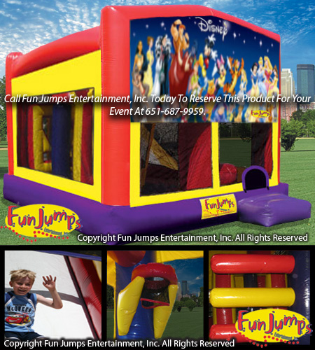 This All in 1 Disney themed combo is a super exciting party rental that would make any event a huge success! Inside there is a jumping area, a basketball hoop, a tunnel, pop up obstacles, a climbing ramp and a slide.